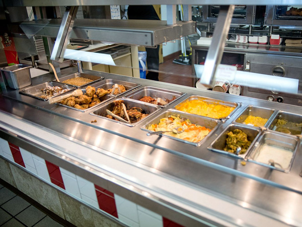 開(kāi)餐前對(duì)菜品樣板柜進(jìn)行衛(wèi)生處理,保持干凈整潔,無(wú)水分、異物、蒼蠅;